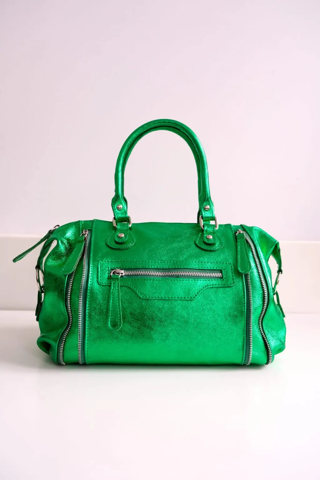 Notre nouveau produit hyper tendance : le sac en cuir métallisé au style rock. Cette nouveauté est disponible en plusieurs coloris : doré, argenté, fuchsia, mauve, lila, vert et noir.
